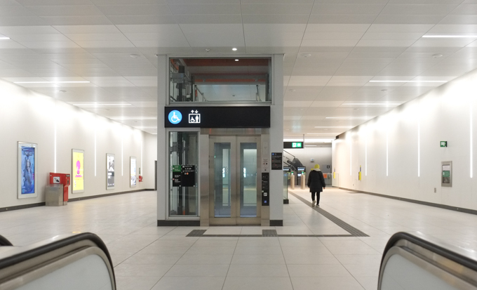 below: This is the interior of the concourse level on one of the subway stations along the Eglinton line. I am not sure which one it is because they all look the same. White everywhere, with an elevator in the middle.