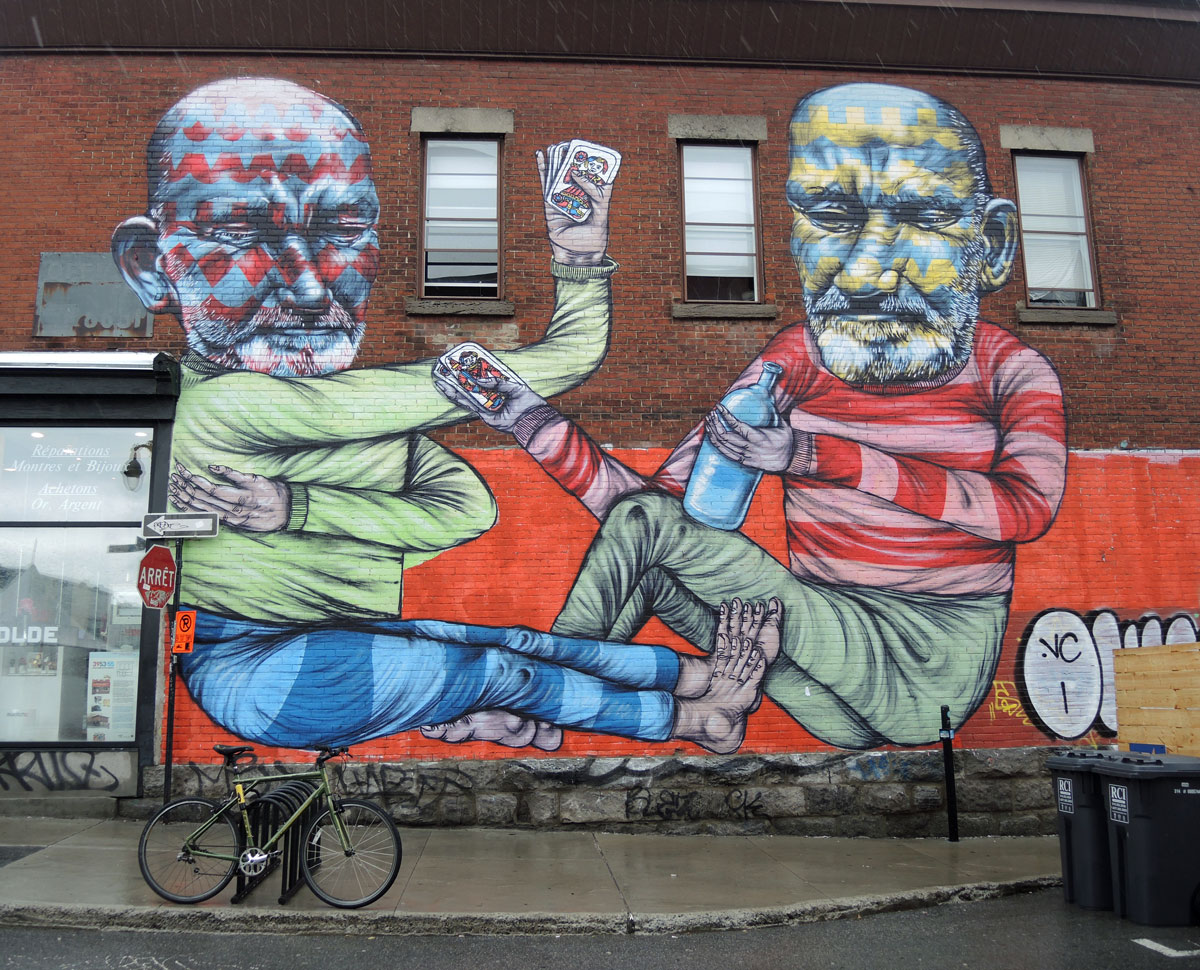 granny painting the pavement on St. Laurent Blvd.