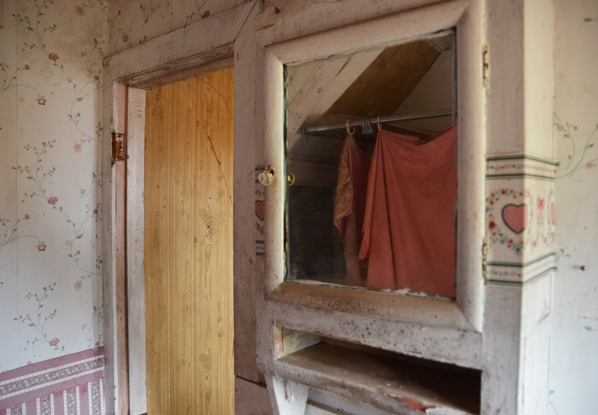 Now uncovered and switched off. Many layers of floral wallpaper including a pot of purple lilacs….. and one fence.