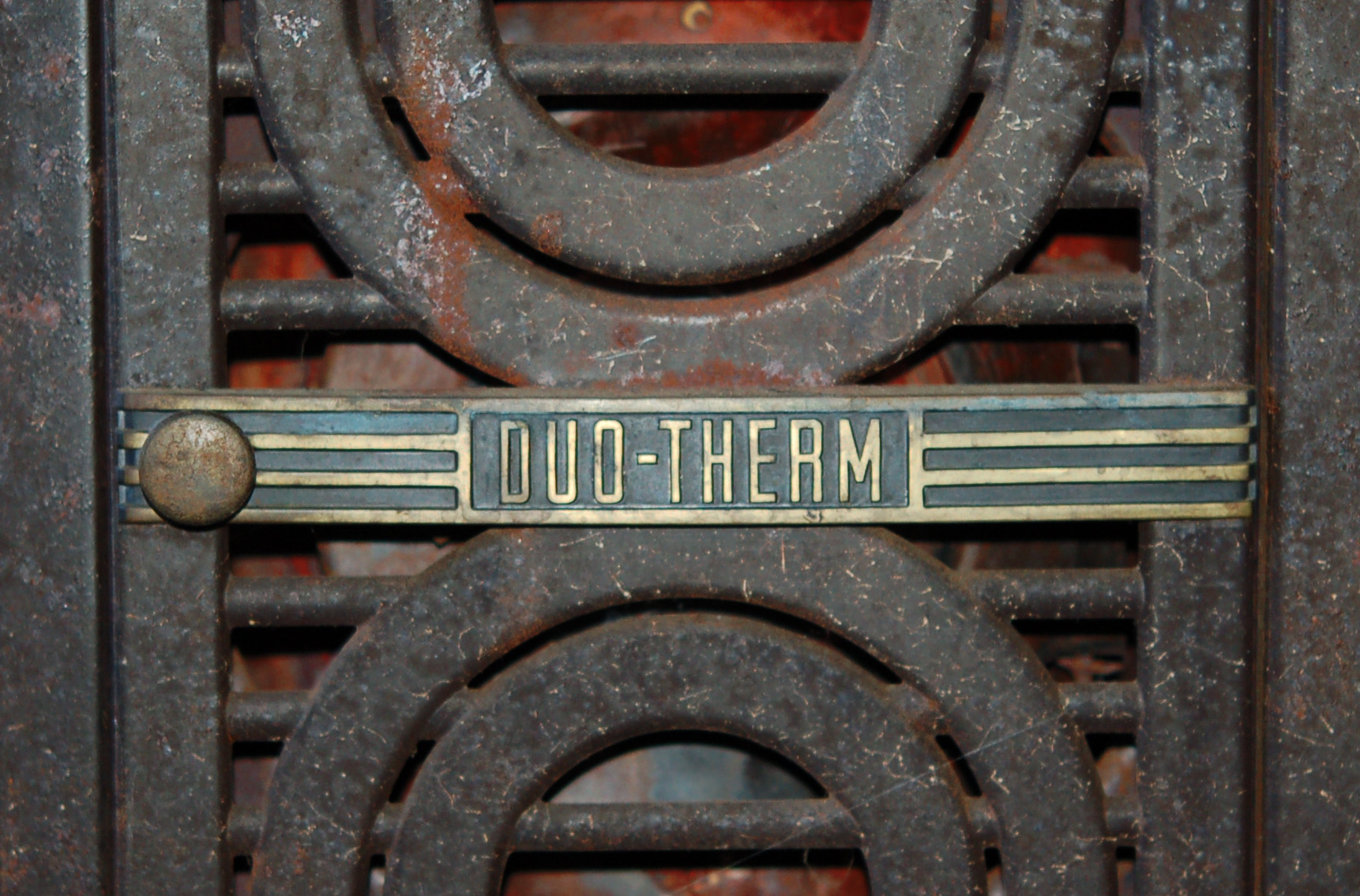 Duo-Therm logo on the door of an old oil burning stove that was in the livingroom. These stoves were built by Motor Wheel Corp of Lansing Michigan. Duo-Therm brand stoves were sold between the mid1930s and the mid1950s but I am not sure what years this model was available.