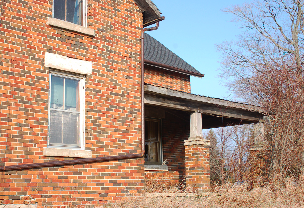 “595144 4th Line is of interest as a property with a vacant, but once substantial brick farmhouse c.1900, large ruined barn with stone foundation, and unusual stone pump house with windmill which apparently was the home, since the late 19th and much of the 20th, of the Fletcher family…. James Fletcher Sr. had originally built the log house for the family on the lot directly across. This later became a blacksmith shop. The property 595144 is currently for sale and deserves further examination and proper recording, as it is vulnerable to further damage/destruction.” from the ‘Cultural Heritage Landscape Assessment Report, town of the Blue Mountains’ dated Sept. 2009. Explored in November of 2012.