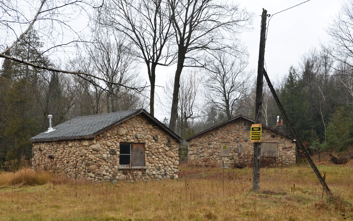 On a dirt road in Mulmur township, just north of Hornings Mills and near where River Road meets Sideroad 20, there is an old stone gate with the word Flintstone built into it. We were there on a rainy November afternoon.