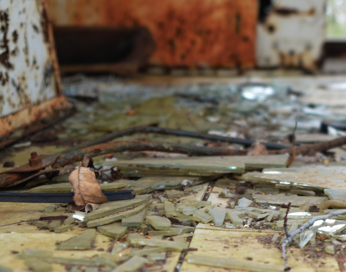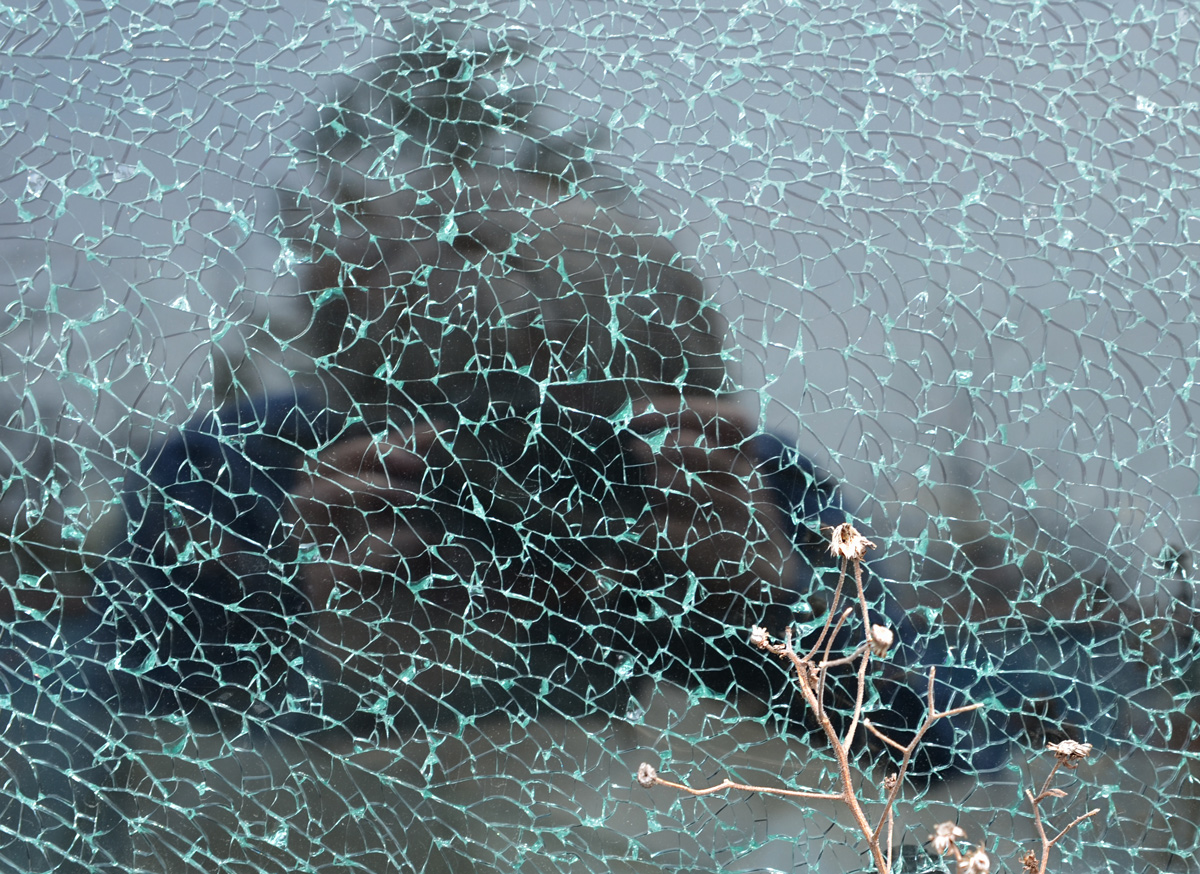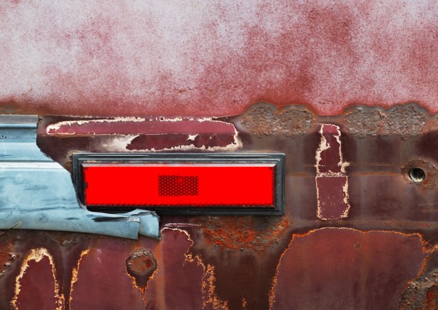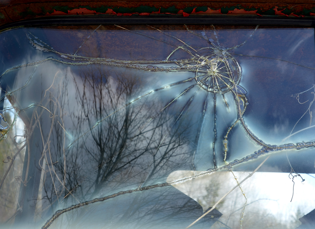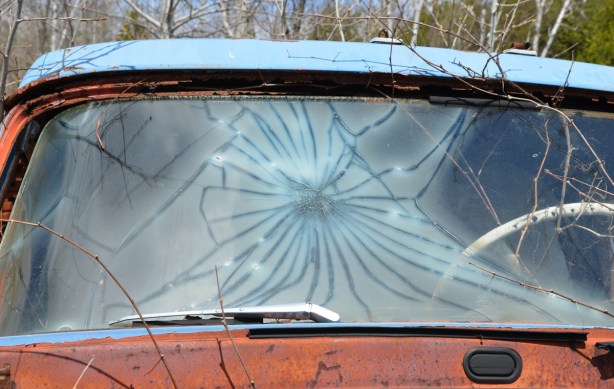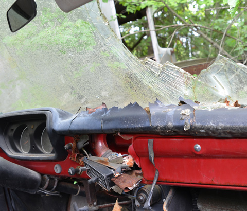 The music’s died – someone tried, in vain, to remove the radio. Bright red dash and a broken windshield.