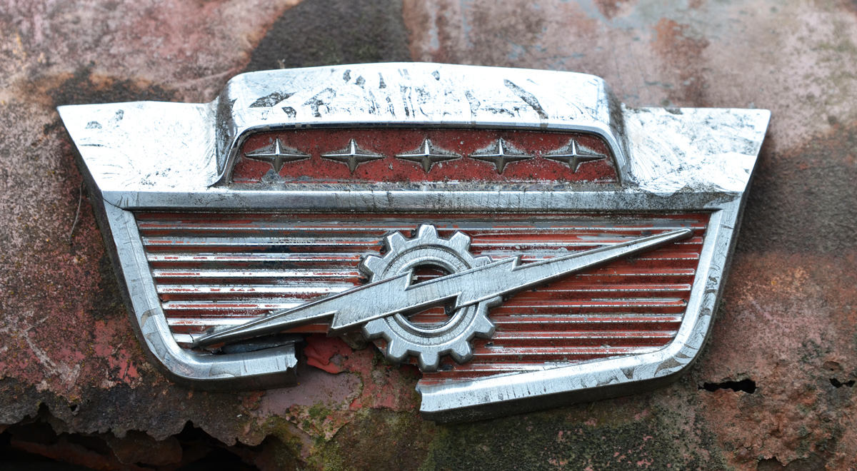 A broken logo that once said V Eight Gyro Matic, probably from an early 1950s Dodge. V Eight is the engine that was in the car; gyromatic was the type of transmission