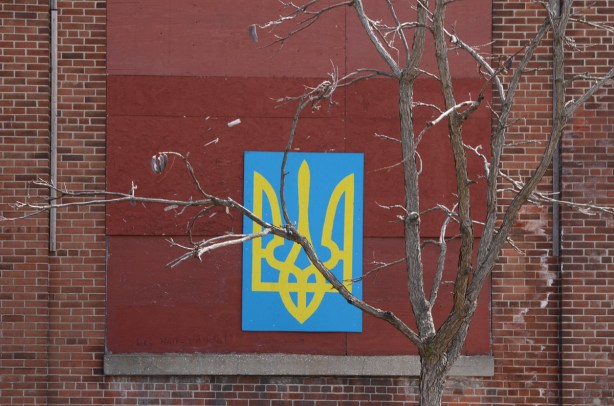 below: Around the time that Russia invaded Ukraine in February 2022, this sign appeared on the old foundry building near the Distillery District. True, it’s a symbol not a word but the word “Ukraine” was also posted on the same building (and in the same blue and yellow). I have a photo of it somewhere!