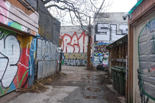 looking down an alley in kensington, view of Uncle Vintage clothing at the end, murals on both sides of the alley
