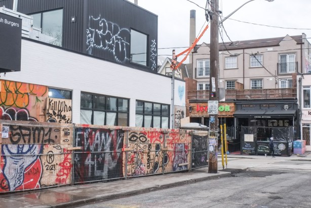 small construction site on yonge street, taking up space on the street, in front of College Park shops