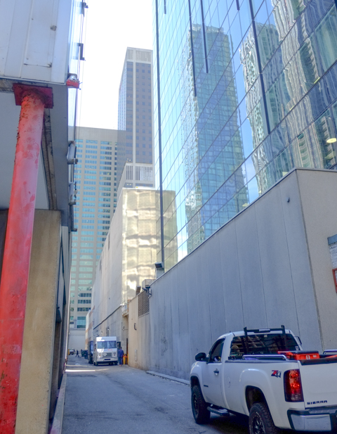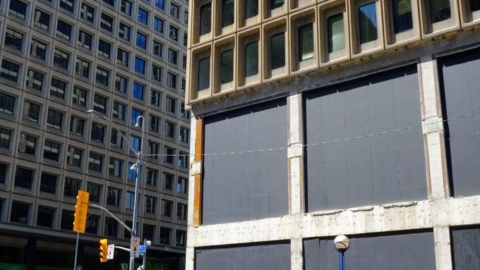 below: The north side of the CP Railway corridor shows signs of its more industrial past. This building with its curved glass sidelights and other small Art Deco finishes, sits empty. Previously it was home to a plumbing company but they have moved to new quarters elsewhere in the city.