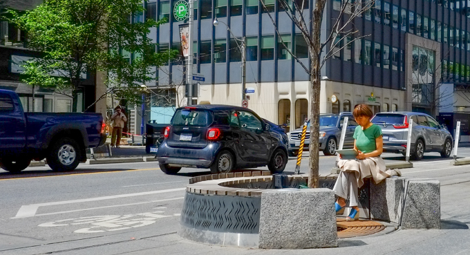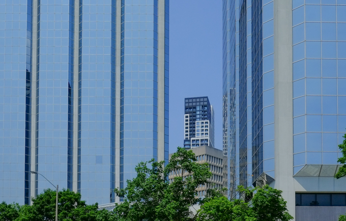 below: Another theme that occurs over and over again on the streets of Toronto – the jumble of different eras. Very old brick houses and new glass and steel towers mixed together along with ages in between. The smaller older structures dwarfed by the newer ones that tower over them.