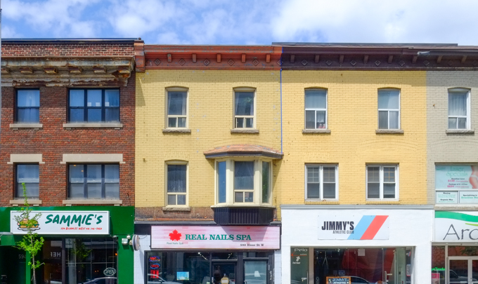 below: The duplex (176-178 Dupont) is difficult to see because like so many other older residences on main streets, an addition has been added to the front to facilitate a store or a restaurant. At the moment, 176 Dupont is a Mexican restaurant, even though the says Pastrami (close enough!).