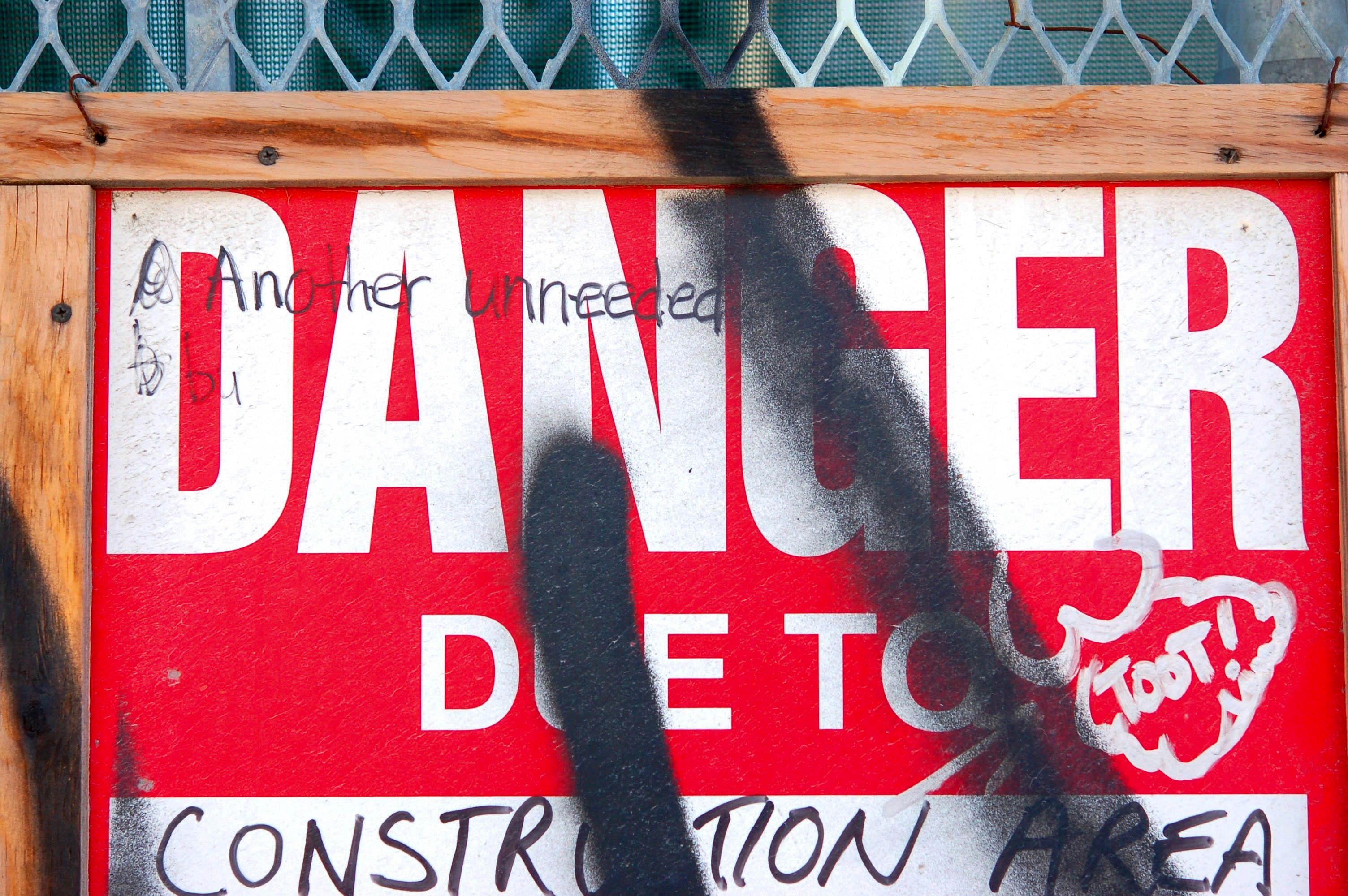 Some of the better alterations I have seen are to these construction signs. Danger due to greed. Sterling Ave. in the Junction area.