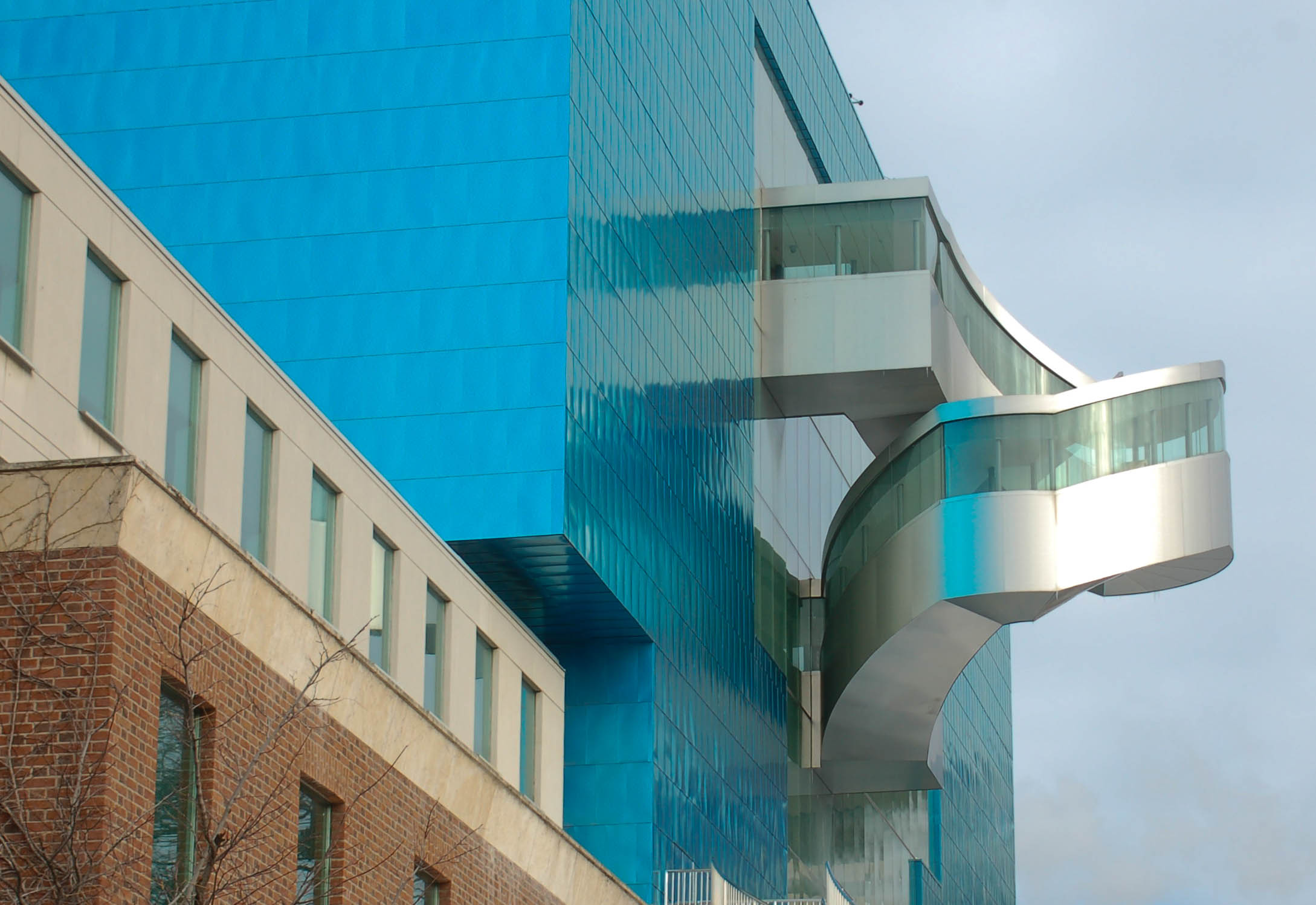 New staircase on the south side of the Art Gallery of Ontario. This staircase is one of the architectural features included in the renovations of the art gallery. It was designed by Frank Gehry and it opened to the public in December of 2008. The staircase is part of a blue tinted titanium and glass wing that overlooks Grange Park.
