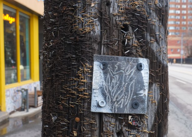 Many thanks to Sarah Serata who emailed me a few days ago with some photos that she had taken while out walking around the city.  The photos were of some of the graffiti signs that have been appeared in the past couple of years.  She wanted to know if I knew the name of the artist(s) responsible for the signs.  But unfortunately I don’t know the answer.  Instead, I have added a few of my own photos from the past few months and put them all together in this post.  If you can enlighten us as to who has posted these signs, please let us know!