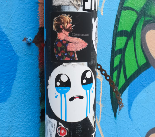 painting of a teal coloured man on a wood fence in a Kensington alley