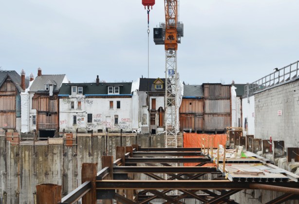 below: Looking west from Bathurst Street across the big hole to the backs of the houses on Markham Street that are empty and boarded up.  Some of them will be retained in the new development.