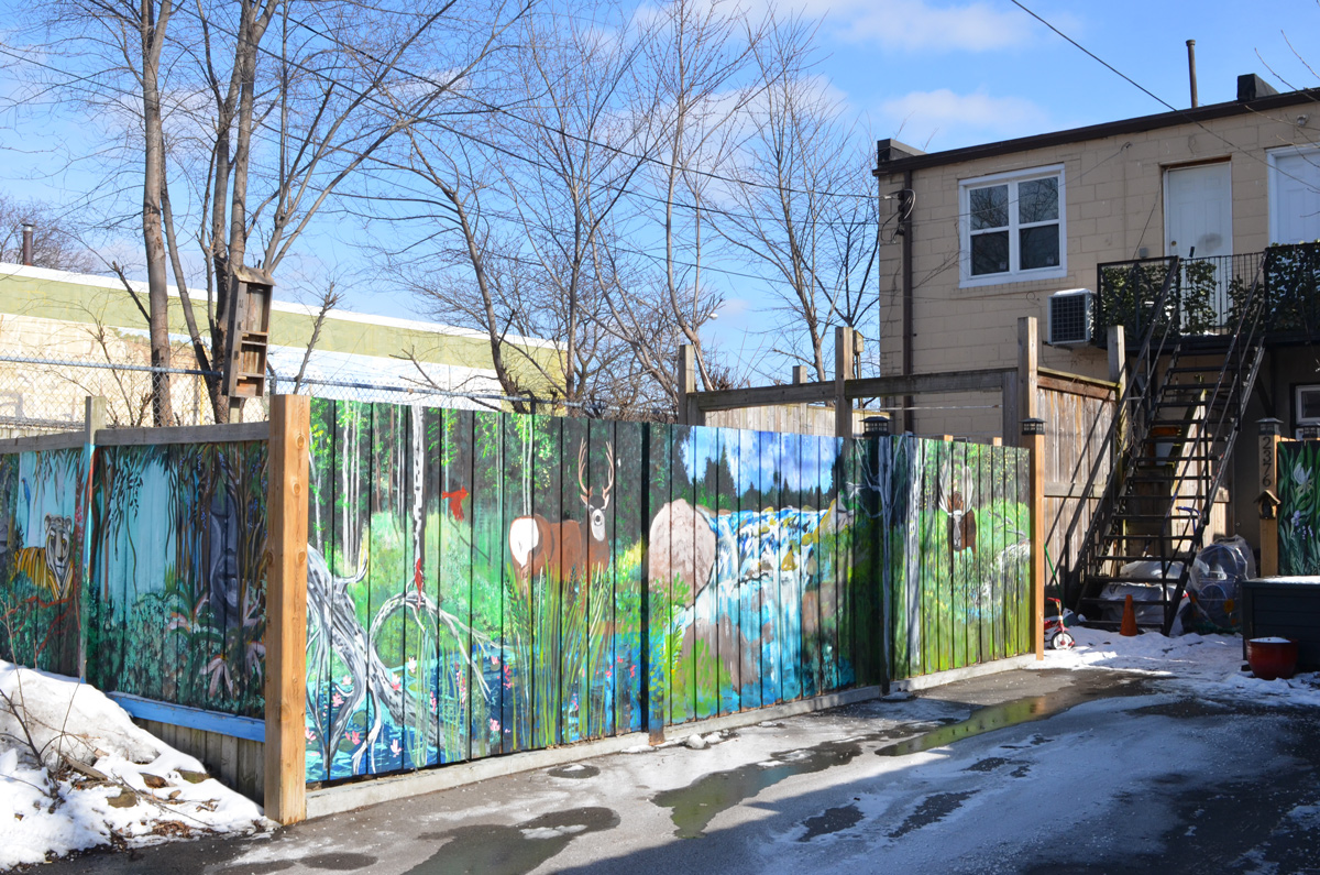 below: Shown here is one of the numerous alleys, that crisscross downtown Toronto – Cottage Lane runs north from Irwin Ave for a short distance. Murals have been painted by B.C. Johnson on both sides.