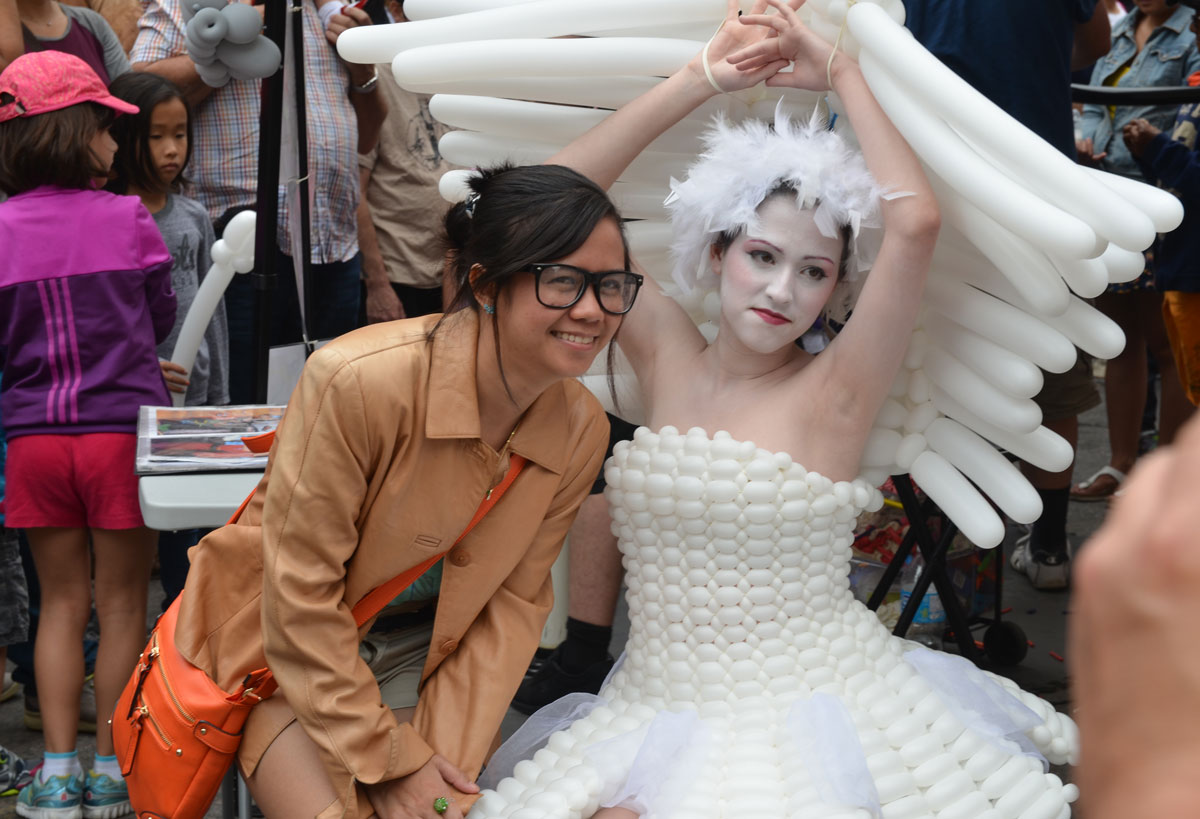 Photo op with an angel in white balloons. Balloon dresses are available from The Twisted Ones
