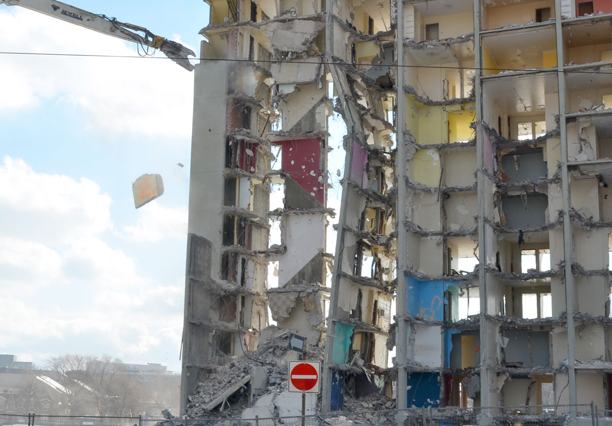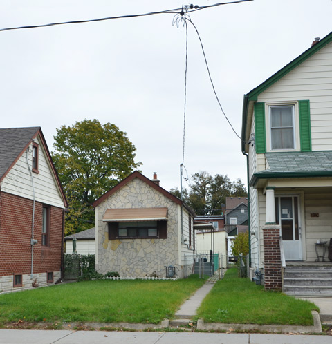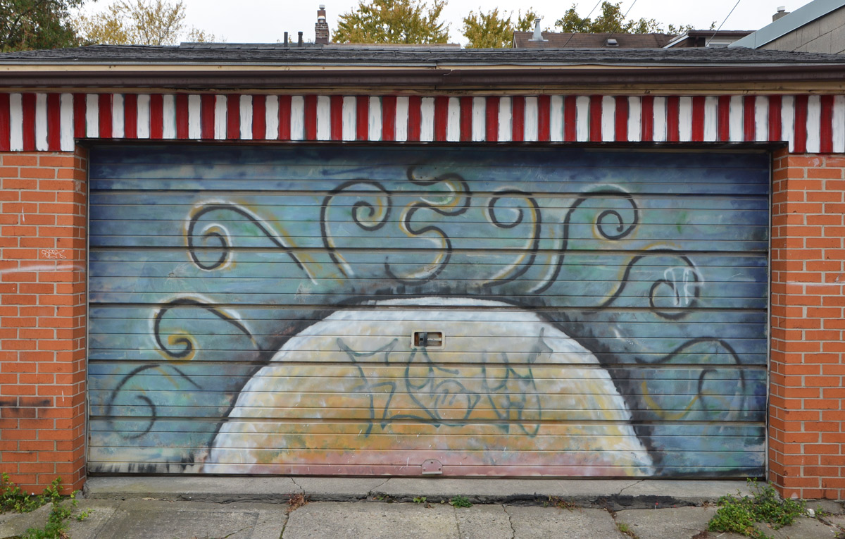 Like an illustration in a book with no words, the story is in the picture and its interpretation is up to you. Raccoons in masks and red capes performing (dancing?) while other raccoons sit in trash cans watching? A whimsical mural by Emily May Rose – if you follow this blog, or if you are familiar with Toronto street artists, you will recognize this immediately as one of hers. These cute little raccoons appear in many places around the city. How many have you spotted? This particular mural is in an alley behind Shaw Street (east side) and north of Queen.