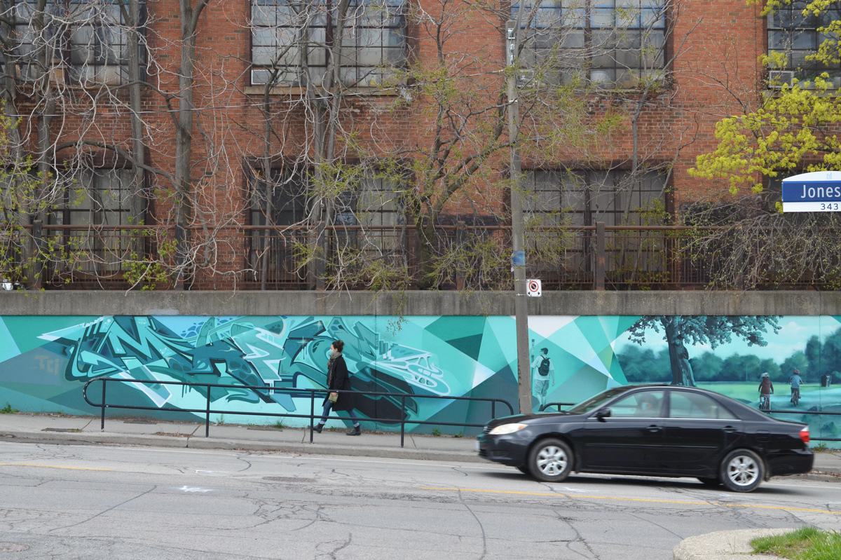 At the southeast corner of Gerrard and Carlaw there is a small park. The retaining wall of the railway tracks marks one of the boundaries of the park and is continuous with the walls of the underpasses. It too was painted by Ryan Smeeton but with the help of Elicsr, Smug, Tenser, and Steam.