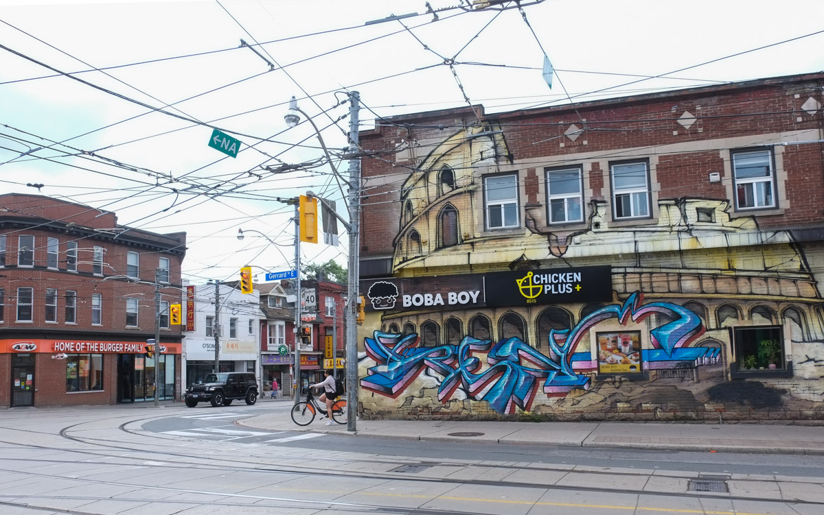 below: Chinatown East mural by ACK crew, bacon, wunder, tensoe 2, and cruz1, on Gerrard east of Broadview. Chinatown East is generally Gerrard east of Broadview, but we’re going to walk west today and leave Chinatown for another day.