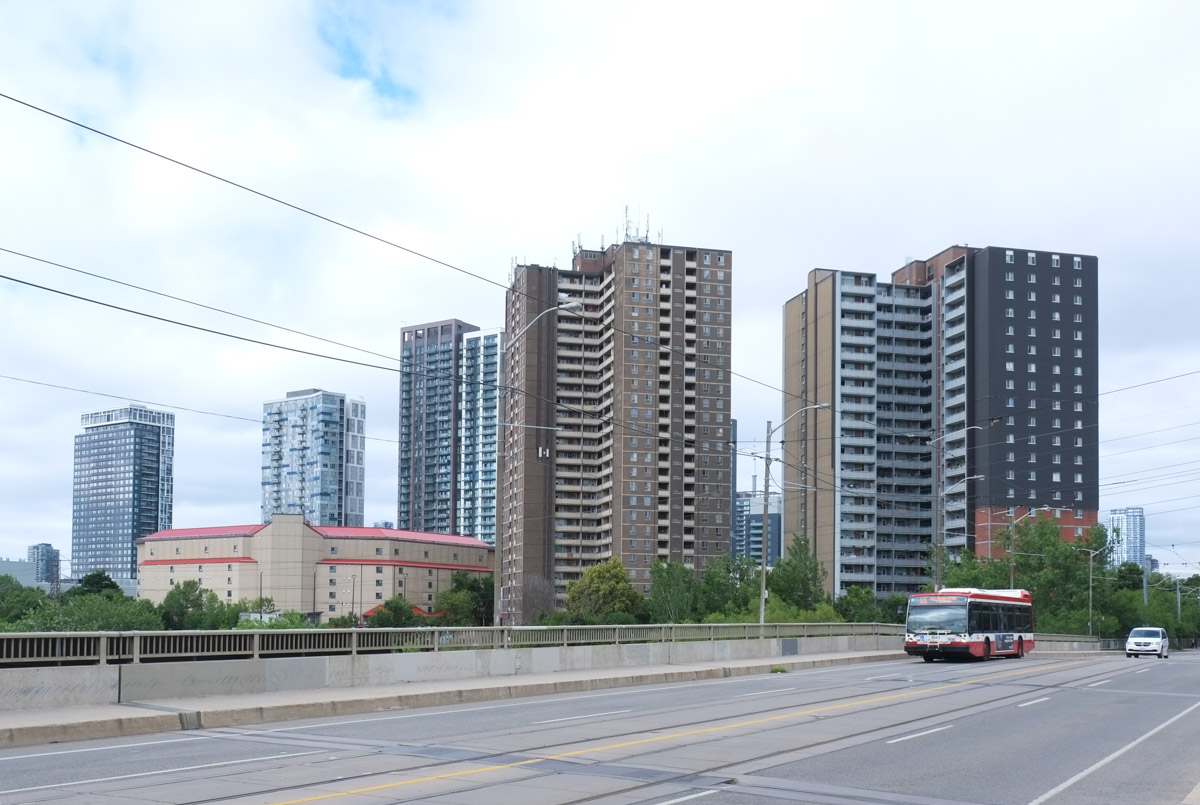below: View from the Gerrard St Bridge (over the Don River and DVP). Looking southwest. The tall brown buildings are at River Street.