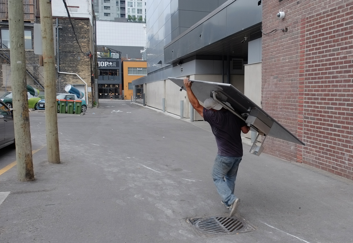 below: This strange pillar (artwork?) is on the southwest corner of Dufferin and Dupont. It used to be the marker/sign for the stores in the Galleria plaza on that corner. Everything there is under renovation at the moment so instead of tearing down the sign, it was converted into this. Hence, “Love me till I’m me again”.