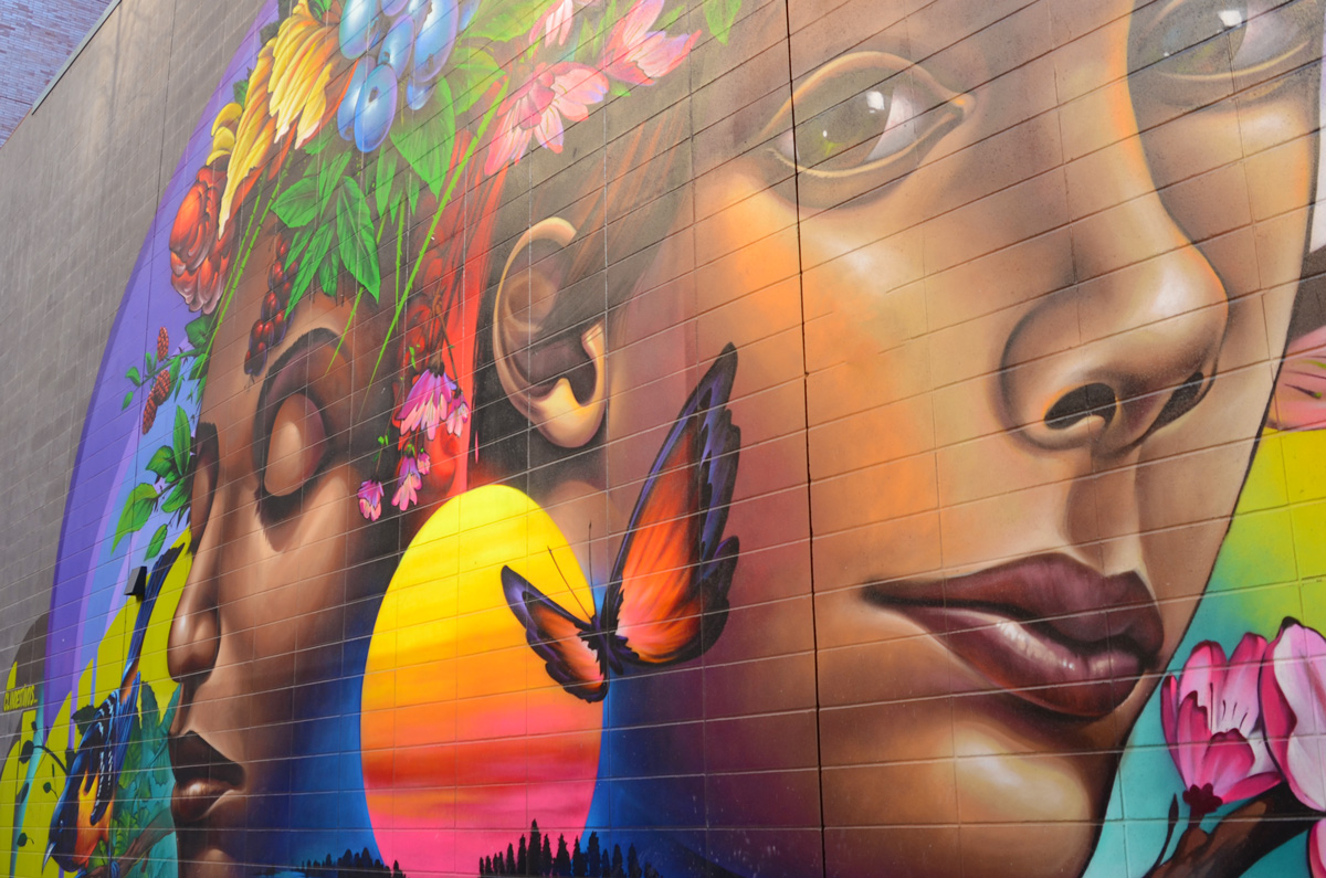 Mural by Ross Bonfanti and Sandra Tarantino with hearts, stars, a flying car and superhero kids.