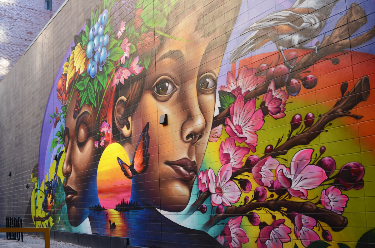 below: A smiling happy mural on the side of a dental office on Dufferin Street painted by spudbomb (2017)