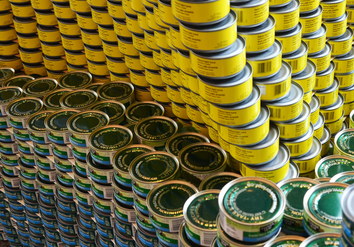 sculptures on display that were entered in a contest in support of the Daily Food Bank, sculptures made of canned food in a theme pertaining to hunger awareness - an oversized trash can overflowing with cans of food. The trash can is made of gray coloured cans