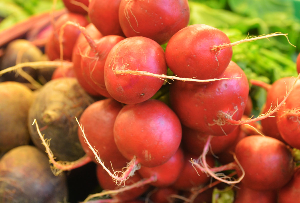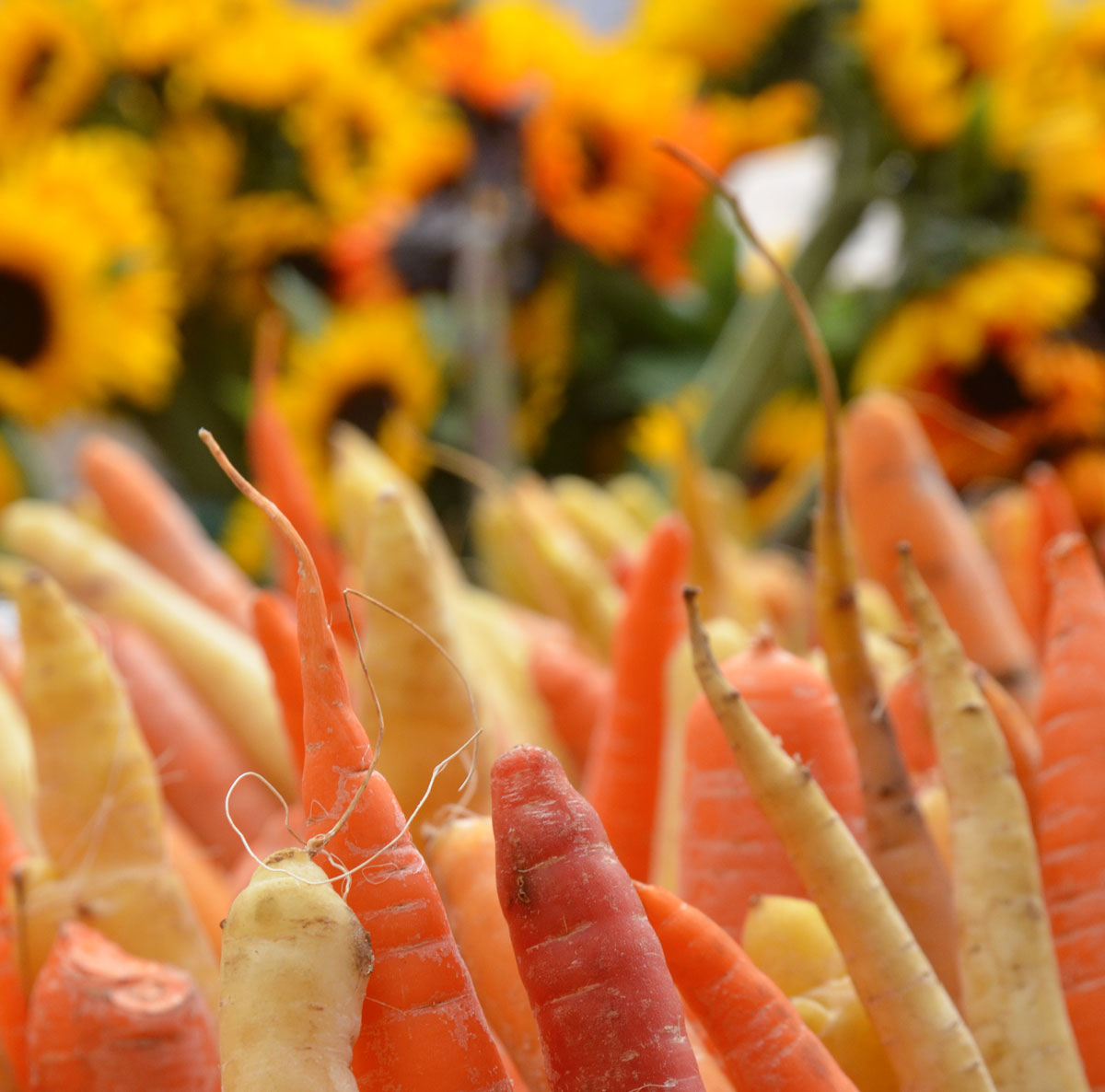 below: From street level – peas in a pod, a clove of garlic, a bunch of spring onions, an artichoke, a banana, and in the distance a lot more!