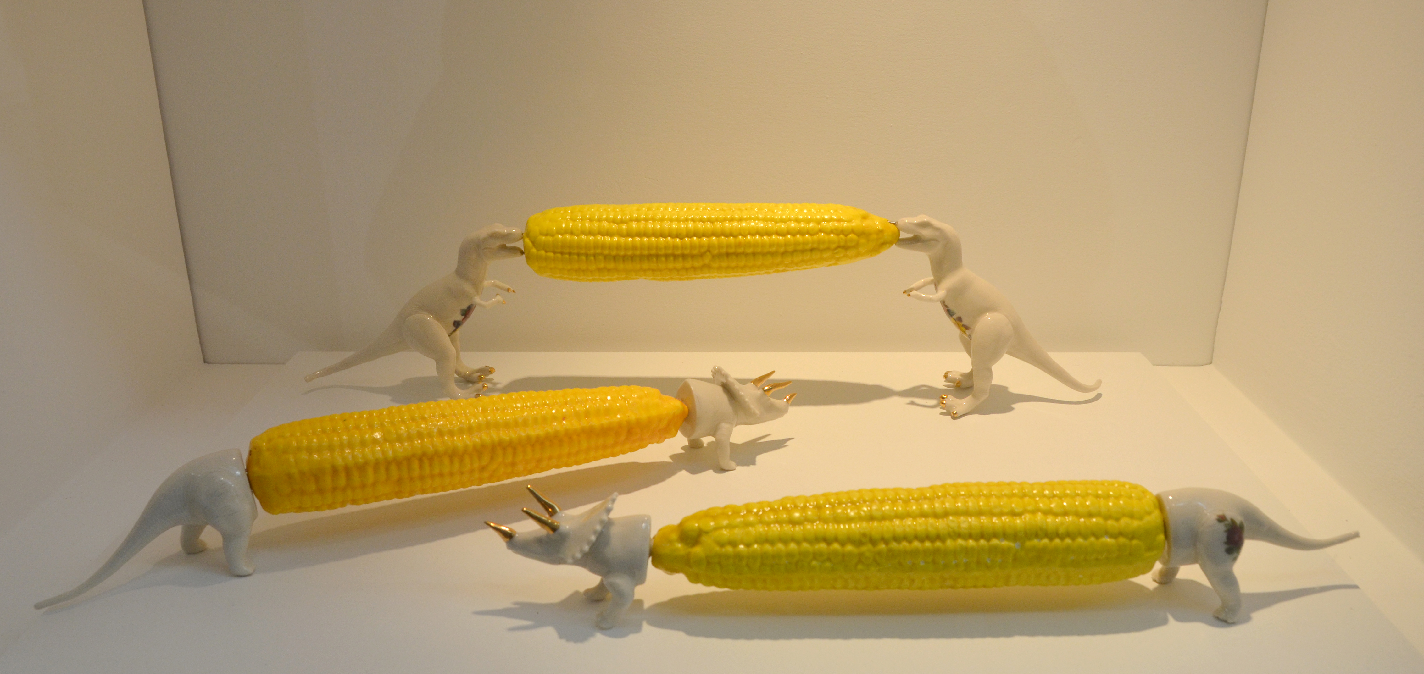Montgomery’s work is in two sections. The above figurine is a newer piece from the series “Despairware” “which references books of demonology and iconographies of feral femininity with Staffordshire figurines from the 19th century” (from the words on the wall at the gallery). She is also showing some of her older work here, a series called “Neo Istoriato” which re-imagines paintings and pottery from the Renaissance. Two examples: