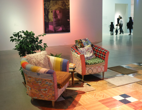 below: A man reaching out a multicoloured hand to a woman by Phillip Saunders covers the back part of the house