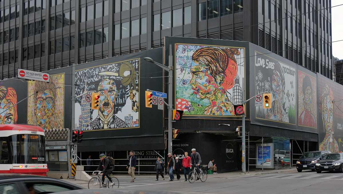 below: Two paintings by Kathleen McGuire (“Shwarma King” and “Abell Street Stop”), and a photograph by Courtney Fairweather of the Gooderham Building. The distinctive yellow building on the northeast corner of Church and Queen was a Shwarma King restaurant in the last years of its life. It is now being demolished.