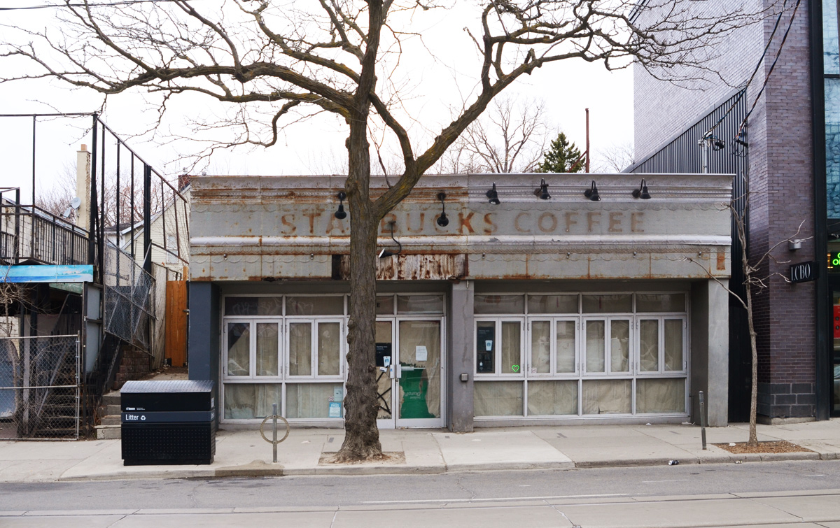 a person sits on a bench in front of the Sunrise Grill on Queen East