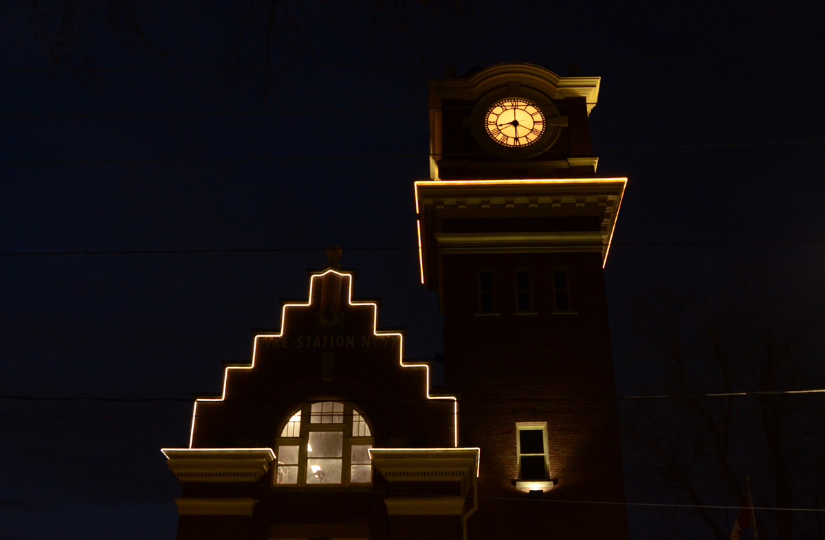 Evening lights, exterior of Firehall number 227 at Queen East and Woodbine, clock tower shows 8:20,