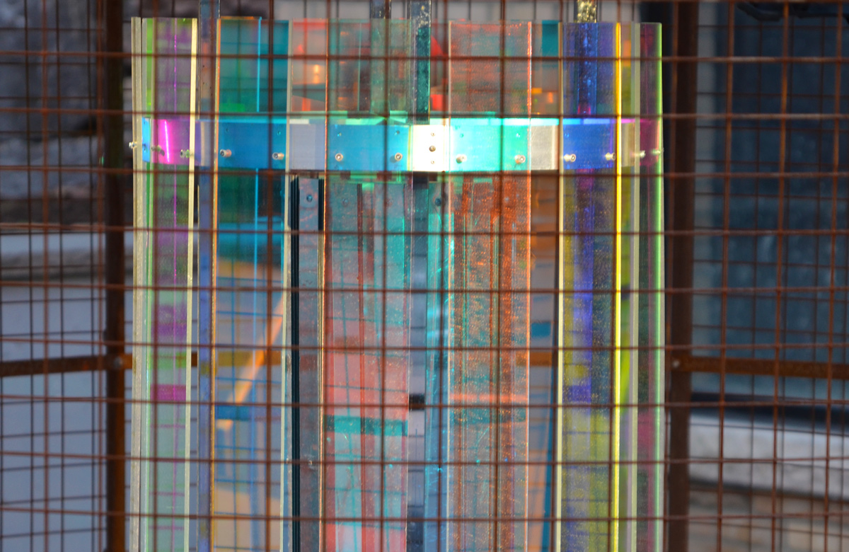 strips of mirrors forming a cylinder that rotates as coloured lights shine on it.