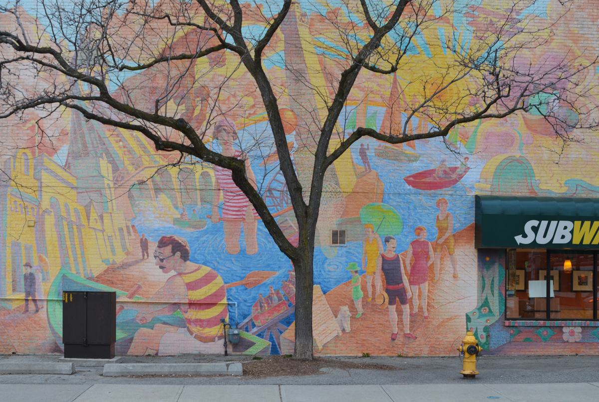 Mural on a wall beside Subway fast food restaurant, a tree in front of the mural, old fashioned beach activities with people in period bathing costumes, red row boat, boardwalk, boat with orange sails
