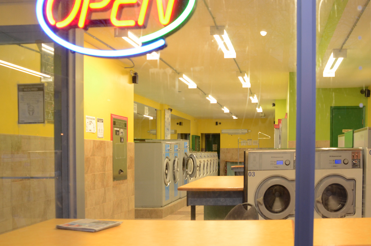 night, exterior of firehall 227, open door showing interior and pepsi vending machine, bench on sidewalk,