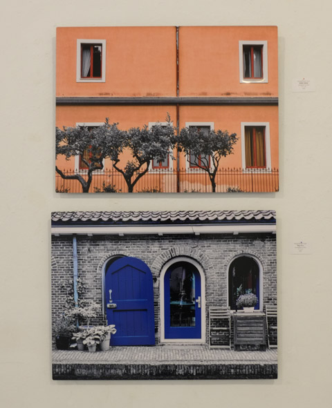 two photographs on a gallery wall, both building exteriors, the upper photo is an orange building, the lower one is grey stone with a blue arched door