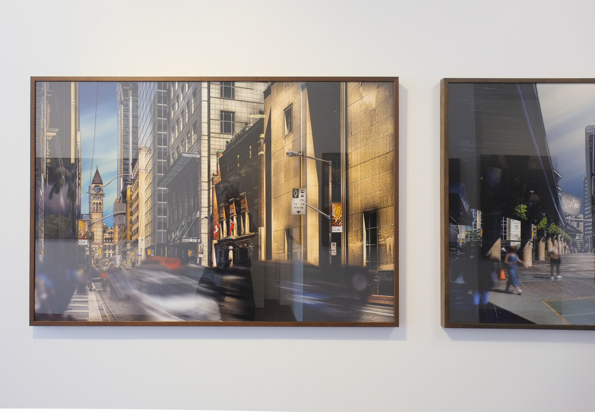 a large photograph of Bay Street in Toronto, looking toward old city hall, hanging on a wall in Elaine Fleck Gallery, photo by Bill Hornbostel