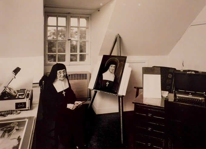 black and white photo from convent series by clara gutsche, nun with painting, on display at TMU Image Centre