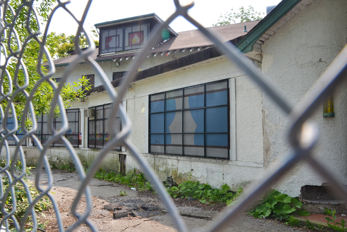 photo from 2015 of Guild Inn surrounded by construction metal fence before it was renovated