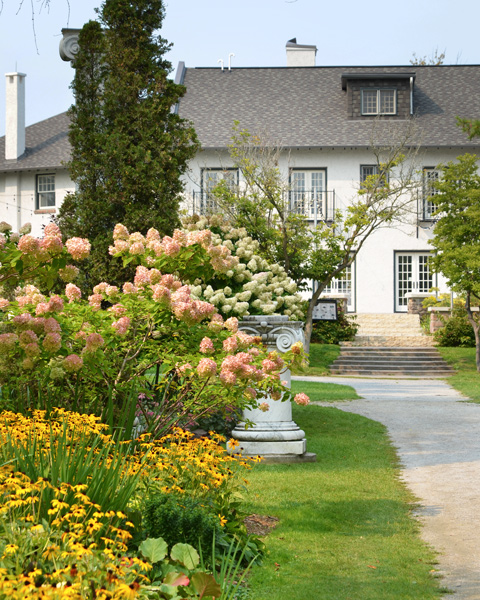 the old white house back of Guild Inn, with small stone columns in the garden along with trees and flowers