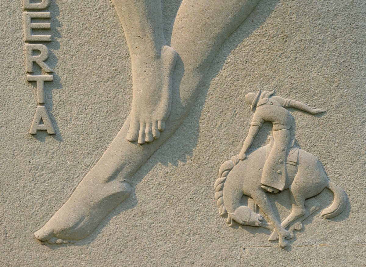 detail of relief sculpture representing province of alberta in Guild inn garden, two bare feet, a cowboy riding a bucking broncho