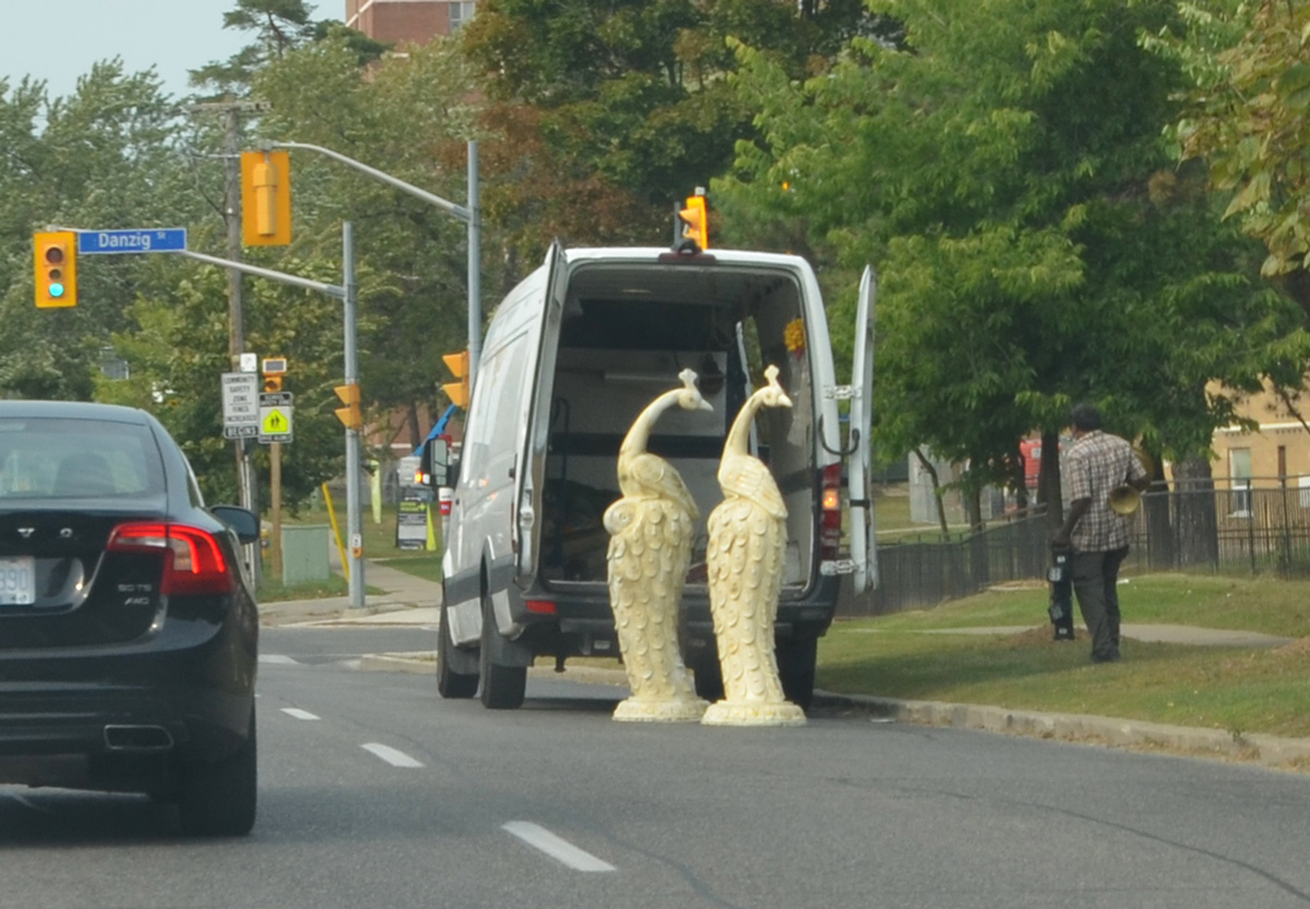 a van is unloading on the street, two large peacock sculptures, about 6 feet high in off-white, standing on the pavement