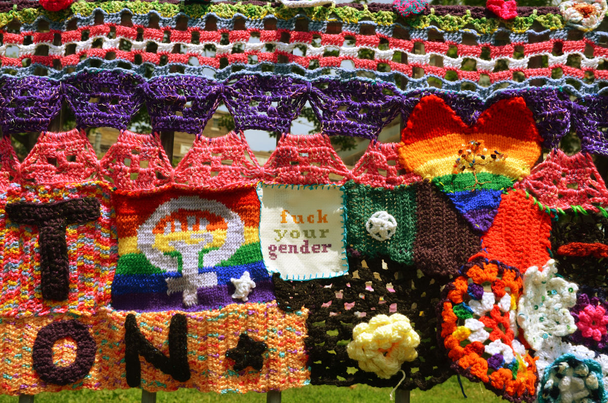 This one is the work of Tracey-May Chambers and it is constructed with red wool, silk, and cotton yarn. It consists of a circle made of connected knit and crocheted circles and within that circle there is a butterfly waiting to emerge.