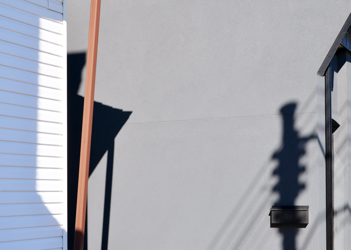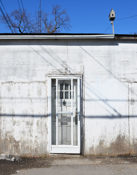 a white door on a white wall with blue sky, also a bird house above the roof, horizontal shadow across the front of the house