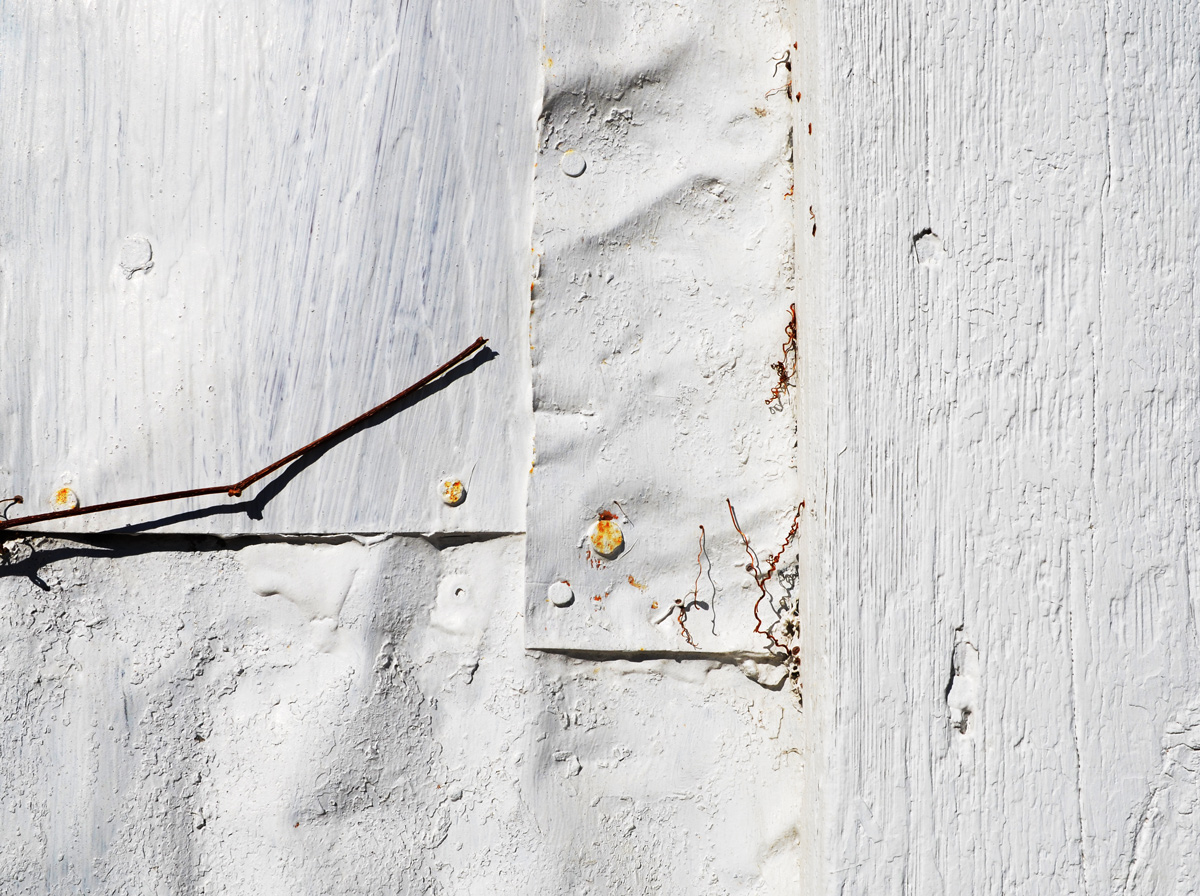 metal wall, painted white, exterior, with some rust, also an old basketball hoop and its shadow