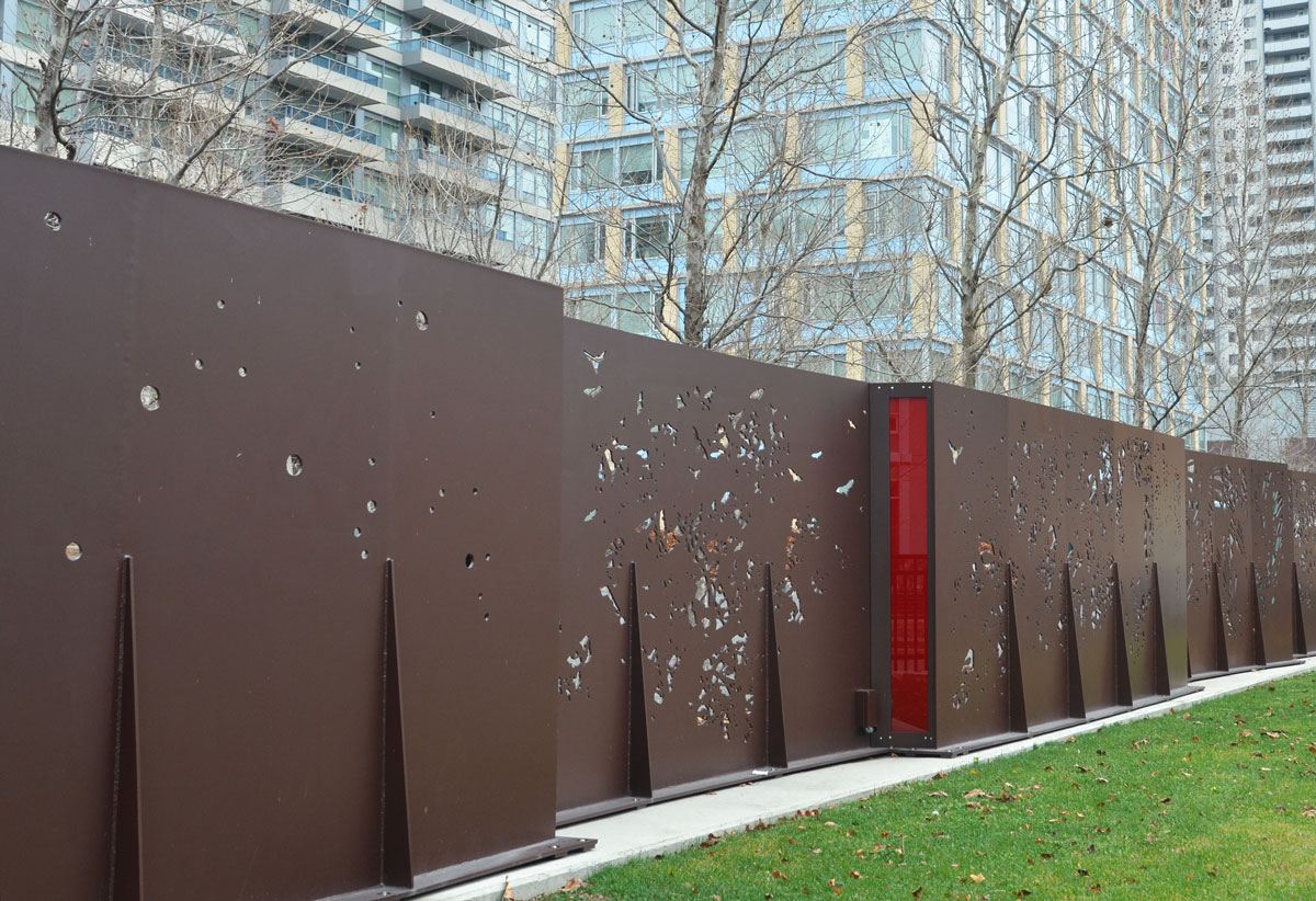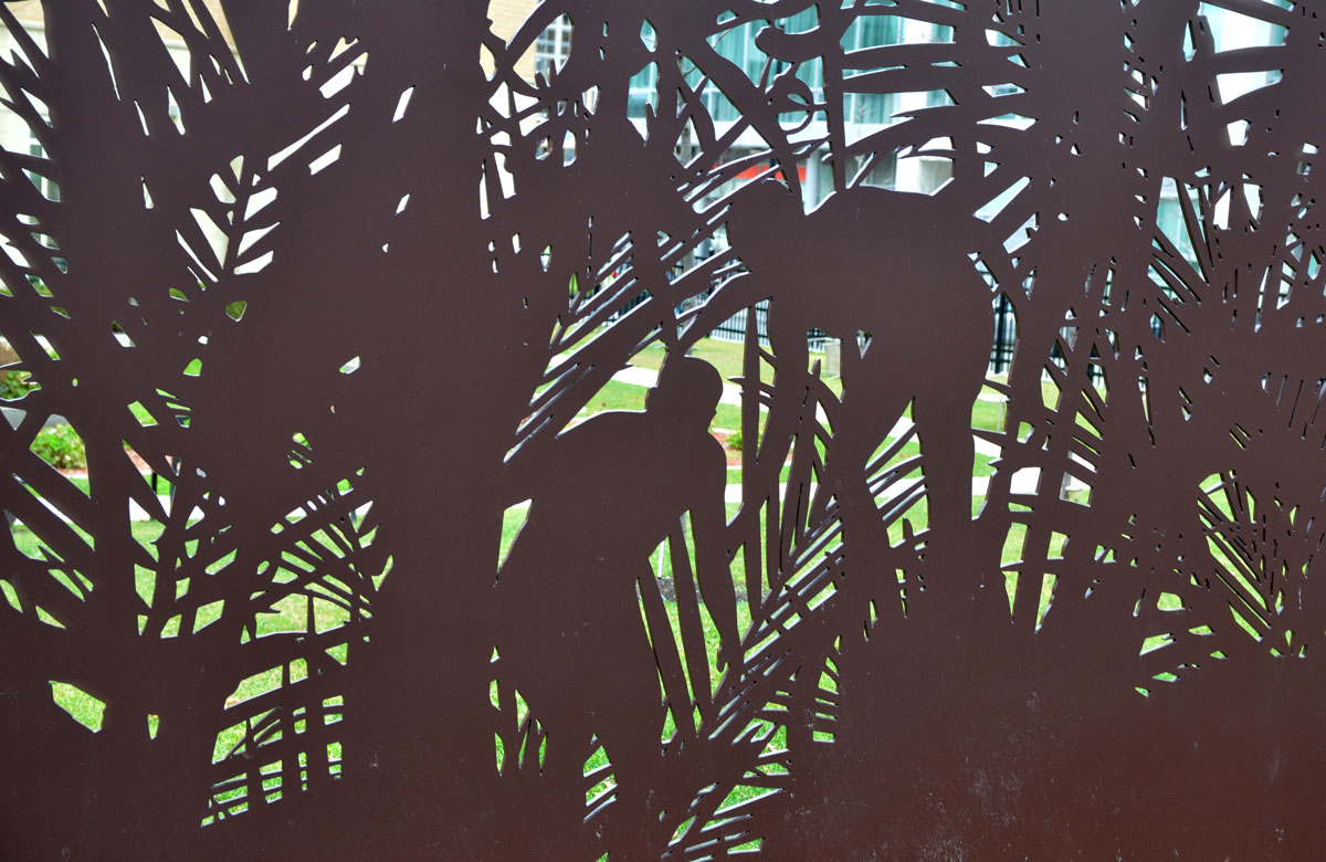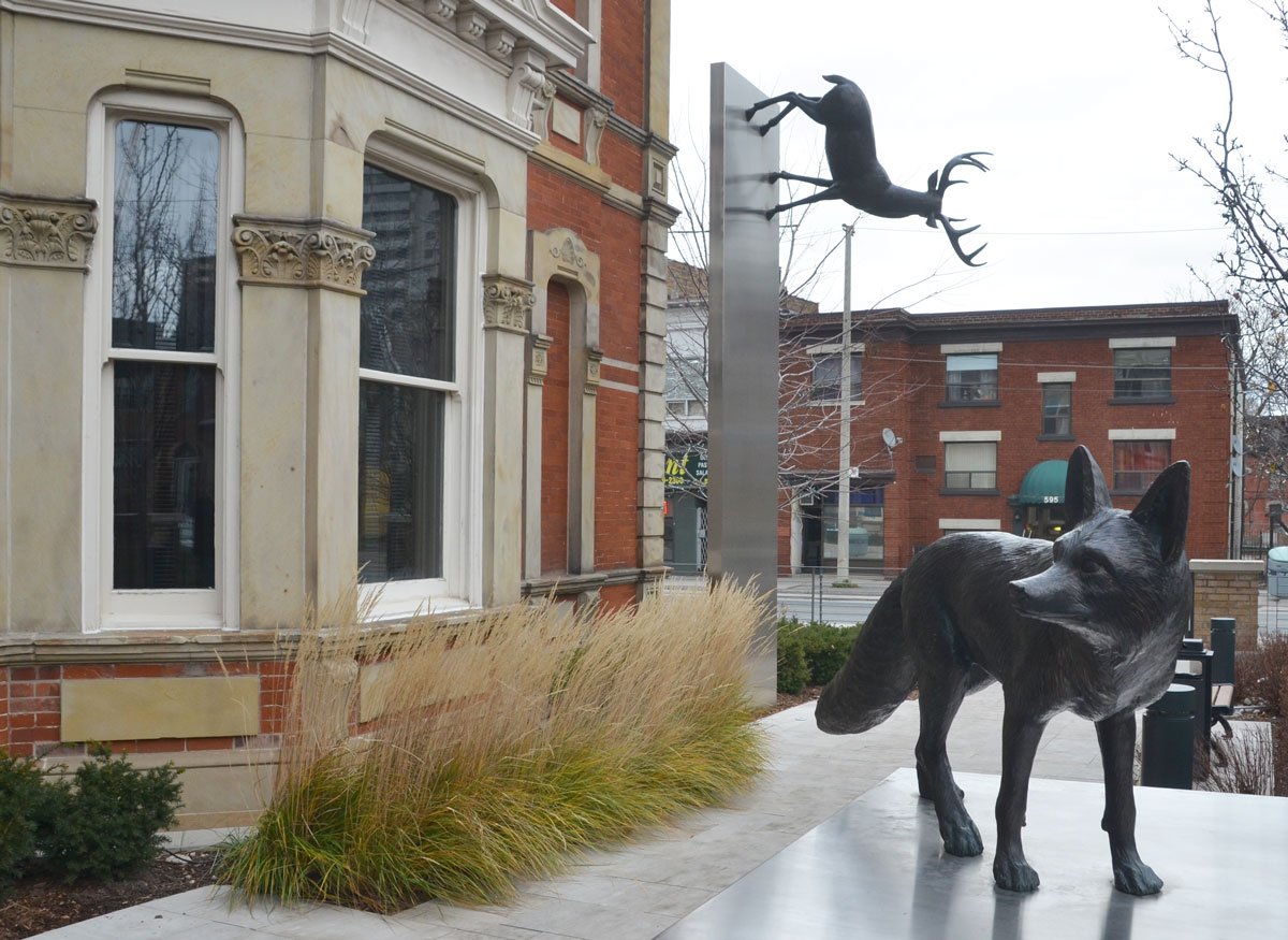 below: Beside Jimmy Simpson Park there are four stainless steel pennants, each with a word – coursing, disappearing, trembling, and returning. These are part of a series of three installations called “Time and a Clock” by Eldon Garnet in the area.