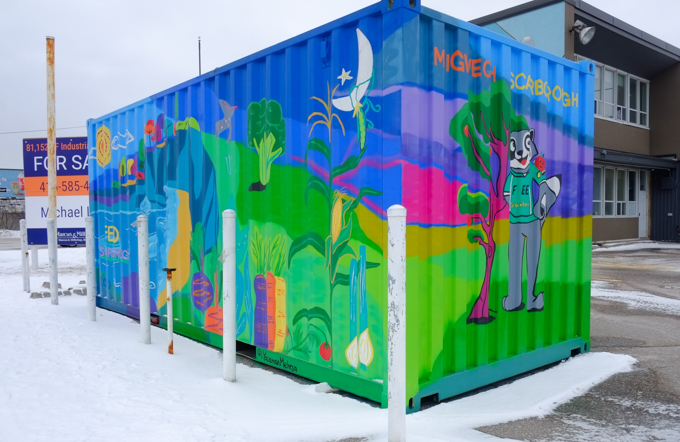 below: Leslieville has two murals. This one covers the side of the building plus the back in pink, red, and orange stripes. This Guidant Bikeshare mural was painted by Mediah, aka Evond Blake, in 2017.